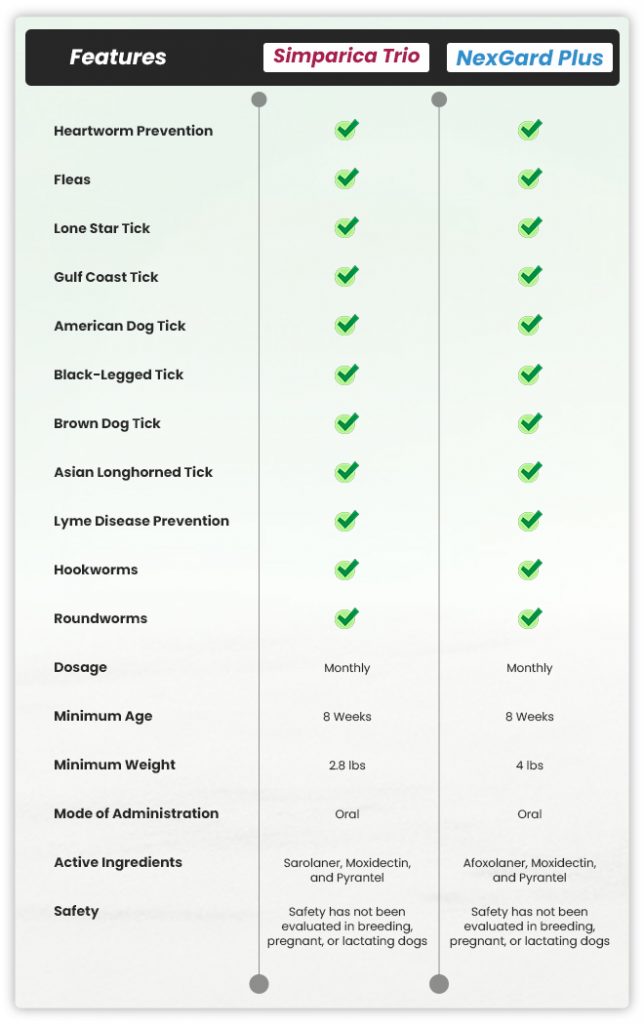 Here’s a detailed comparison between the key features of Simparica Trio and NexGard Plus.